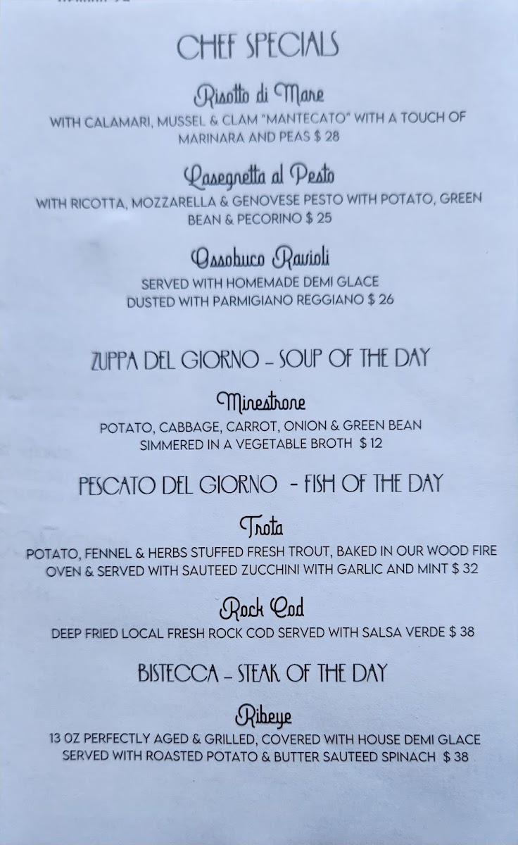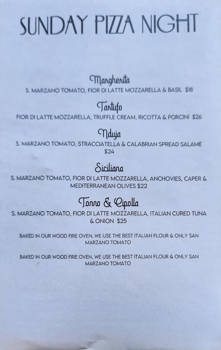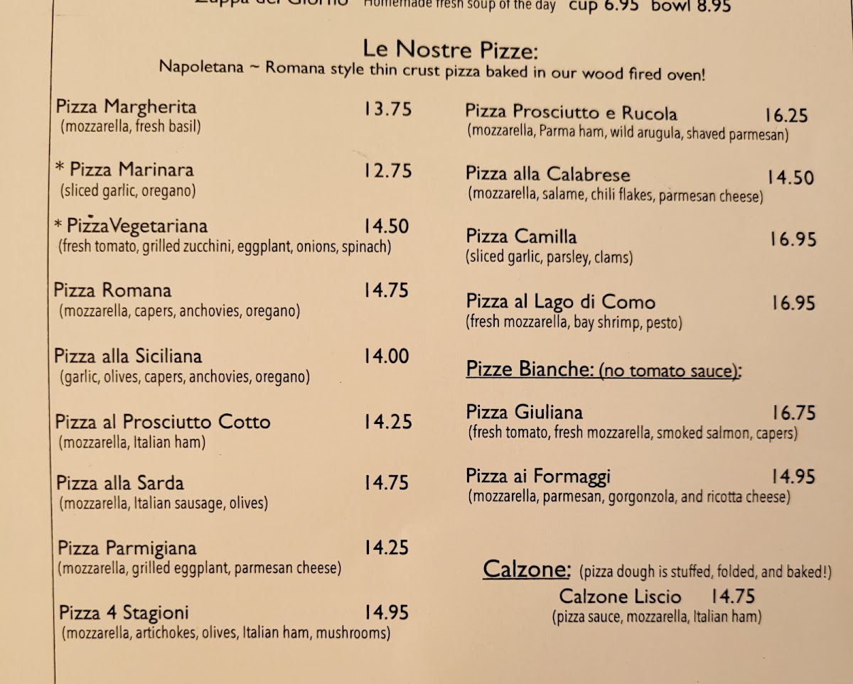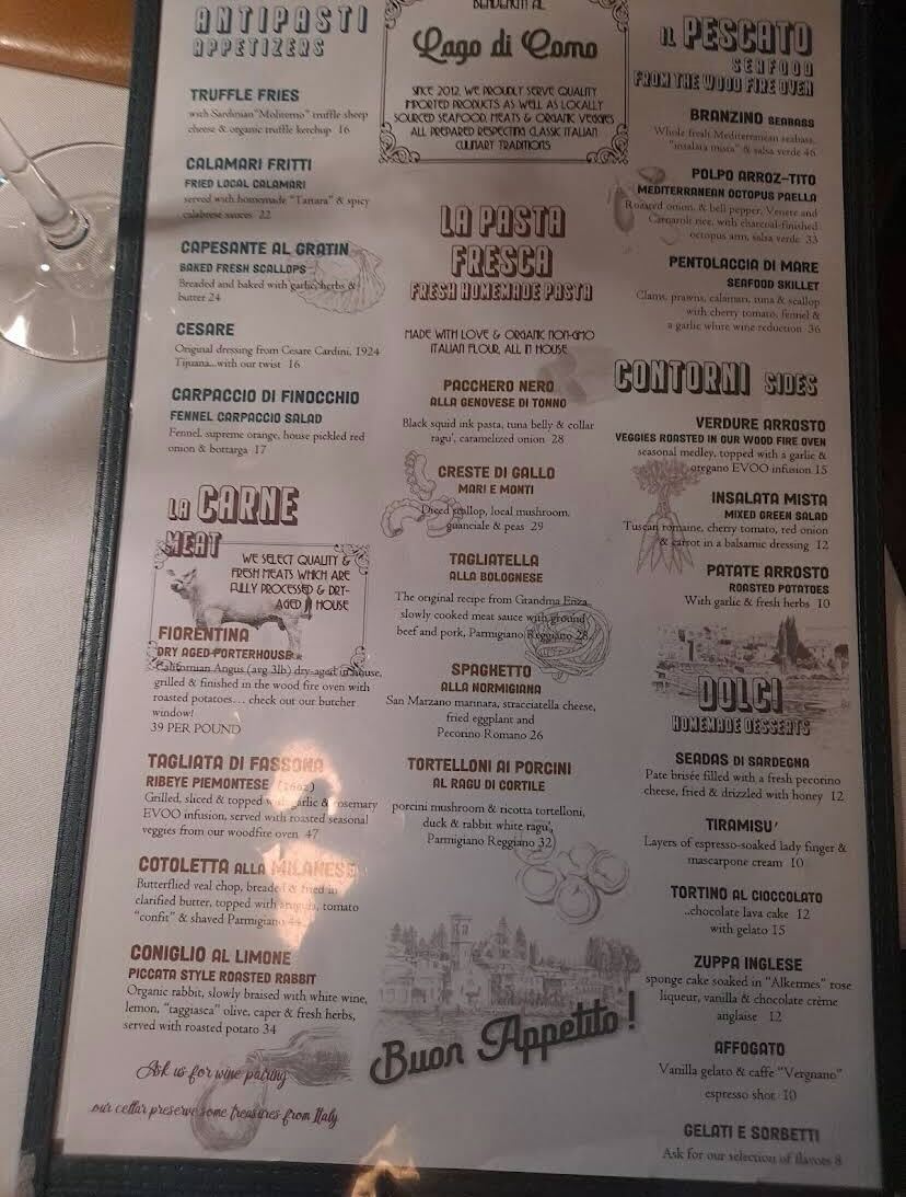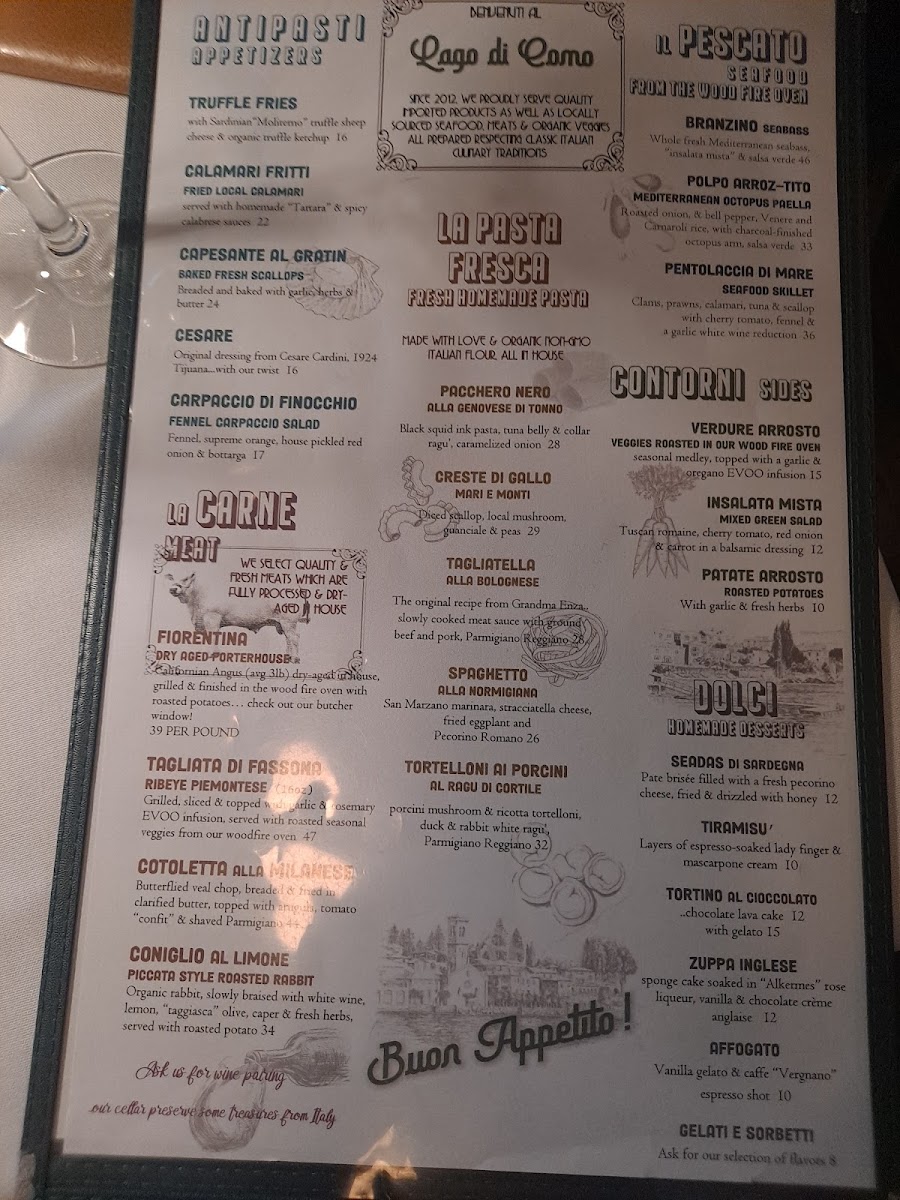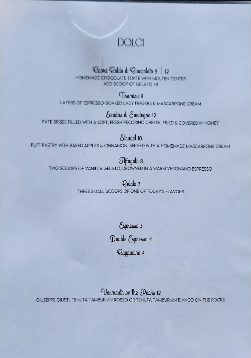 Vegetables take the spotlight with the Verdure Al Forno a Legna, seasonal veggies roasted in the wood fire oven, served with a delicate infusion of garlic and herb EVOO for just $14. And to complete your meal, indulge in their exquisite homemade dessert, the Seadas di Sardegna, a sweet delight filled with fresh pecorino cheese and drizzled with honey for a mere $12. Diners rave about their desserts, with the lemon sorbet frequently mentioned as a must-try!